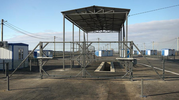 Шлагбаум на автомобильной дороге у пропускного пункта Александровка на территории ДНР у линии соприкосновения в Донбассе