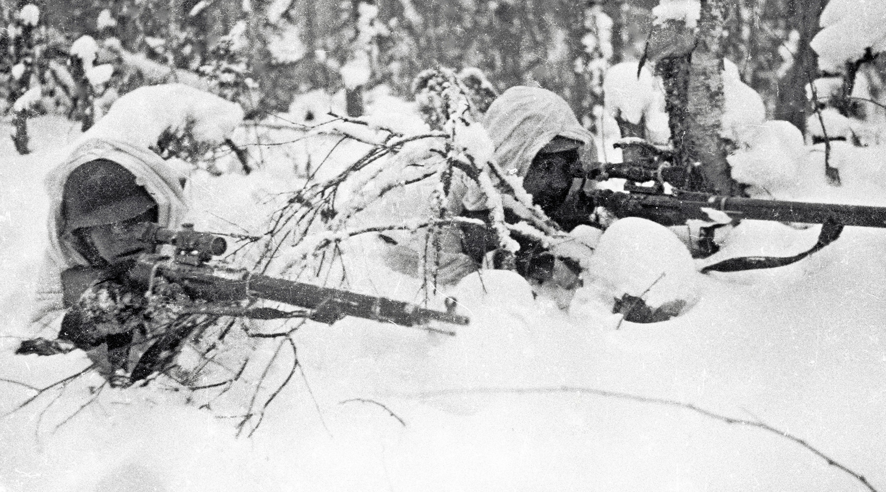 Советско-финская война 1939—1940 годов. Красноармейцы-снайперы в засаде. Карелия