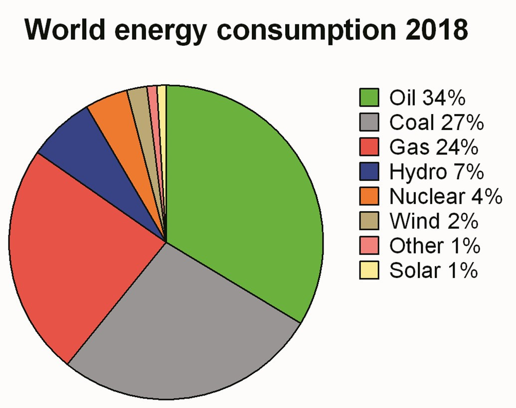 Мировое энергопотребление по доле источников энергии, 2018 год. Данные BP (2019 год).