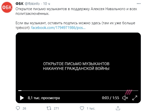 Вчера в интернете появилось «Открытое письмо музыкантов накануне гражданской войны» в поддержку сидящего в тюрьме уголовника Навального. Опубликованное «Лождём» и перепечатанное остатками «ФБК».