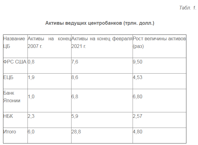Для справки: по оценкам Всемирного банка, мировой ВВП в 2007 году в текущих ценах составил 58,22 трлн. долл. По итогам 2020 года его значение измерялось суммой 83,84 трлн. долл. То есть в 2007-2020 гг. мировой ВВП увеличился в 1,44 раза. Это, заметим, в текущих ценах. А в постоянных ценах (с учетом инфляции) прирост ВВП был еще более скромным. И на этом фоне – почти пятикратное увеличение денежной массы, произведенной «большой четверкой» центробанков.