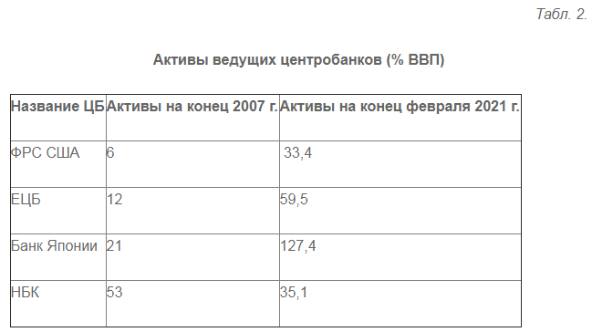 На конец февраля 2021 г. картина поменялась радикально. Стремительный взлет значения показателя мы видим у Банка Японии, на рубеже 2018-2019 гг. он пересек планку в 100%. Сейчас его активы равняются 127,4% ВВП. Очень выросли показатели относительного уровня активов у ФРС и ЕЦБ. А вот ЦБ Китая сократил относительную величину своих активов примерно на треть. Это и результат сдерживания активности китайского Центробанка и того, что в Китае имели место высокие темпы прироста ВВП.