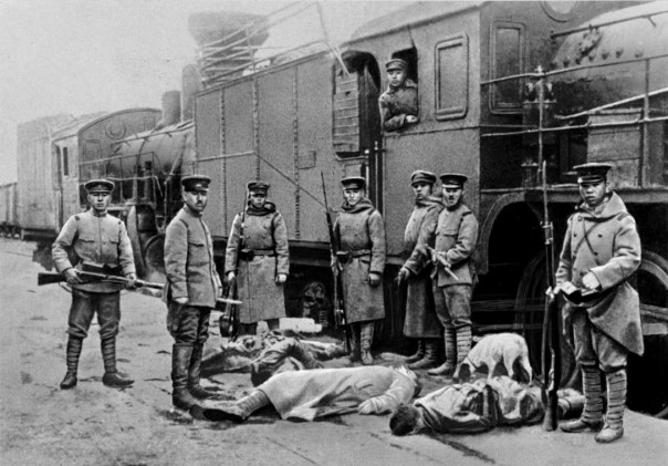 Японские интервенты и убитые ими железнодорожники. Фото: БРЭ