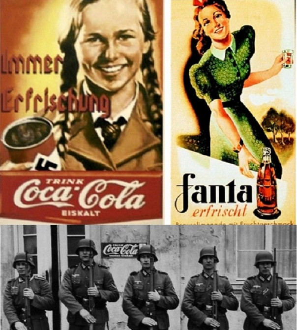 А что это пьёт девица из «Союза немецких девушек» (женский вариант «Гитлер-югенд»)? Какой напиток предпочитает гитлеровская фрау? А чего это там за реклама за спиной у солдат вермахта? Как неудобно-то получилось…