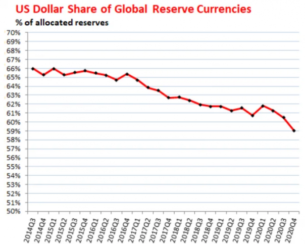 Доллар теряет свой статус мировой резервной валюты. Мировая доля валютных резервов, выраженных в долларах США, упала до 59,0%. Это соответствует 25-летнему минимуму с 1995 года.
