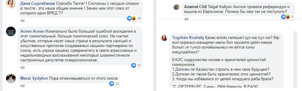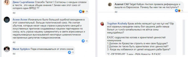 Показательны комментарии узколобых нацпатов к заявлениям узколобого политолога: «ЕАЭС содружество изгоев и хранителей ценностей коммунизма», «Когда мы избавимся от цепей младшего раба брата?», «Зачем нам этот союз, от которого один вред?».