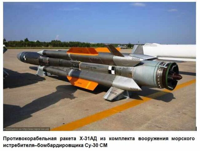 Возьмем, к примеру, основной и самый современный ударный самолет морской авиации ВМФ РФ Су-30 СМ. Эта машина оснащена разнообразным вооружением. В том числе противокорабельными ракетами семейства Х-31, включая новейшую модификацию Х-31АД.