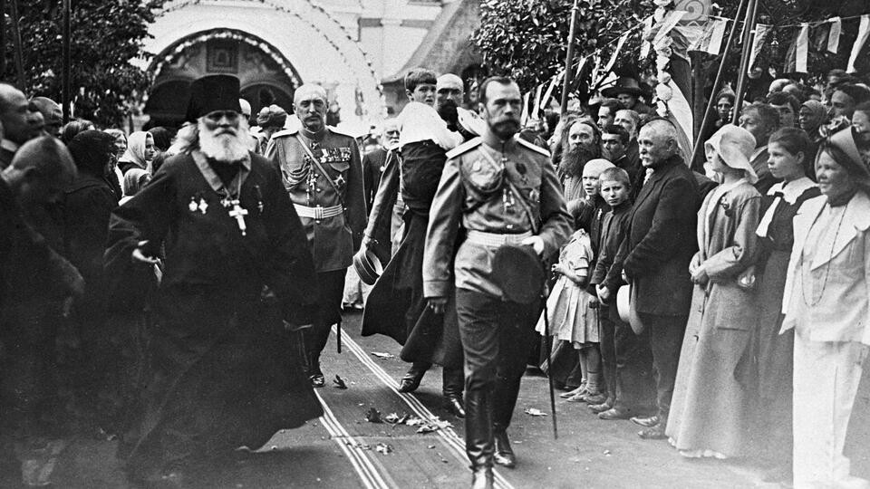 Российский император Николай II с наследником цесаревичем Алексеем (на втором плане на руках казака) отбывают из Новоспасского монастыря. Празднование 300-летия Дома Романовых