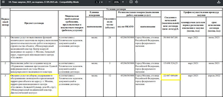 На сайте МММК есть страница с закупками организации, на основании данных которой можно сделать вывод о том, что с оплатой разнообразных подрядных работ кластер не скупится. Одна беда – названия фирм-подрядчиков, получающих столь крупные суммы, упомянуть "забыли". Так, например, как следует из плана закупок на 2021 год, кластер в марте произвёл закупку услуг по уборке, содержанию и обслуживанию помещений в Диагностическом корпусе (та самая "Хадасса") – доме 46, строение 1 на Большом бульваре в Сколково. Сумма – 22 887 089 рублей. Срок – 12 месяцев. Итого за уборку помещений в этом здании подрядчик получает 1 907 257 рублей в месяц! И такого рода закупок в кластере можно найти ещё немало.