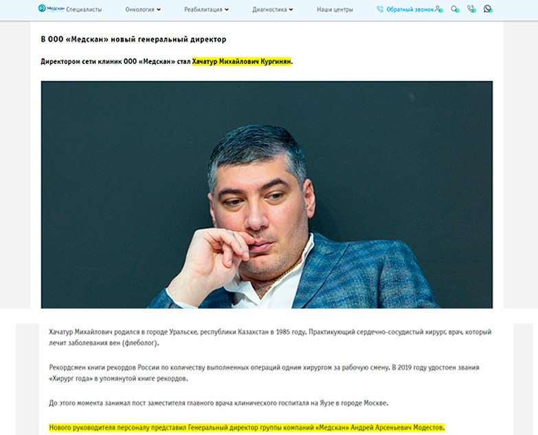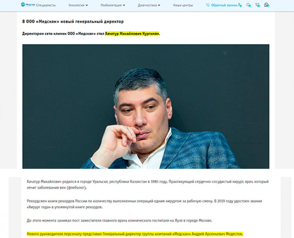На сайте сети клиник "Медскан" сказано, что с 6 октября 2021 года новым главой ООО "Медскан" стал известный хирург Хачатур Кургинян. Андрей Модестов, будучи главой ГК "Медскан", уже представил нового директора сети клиник персоналу.
