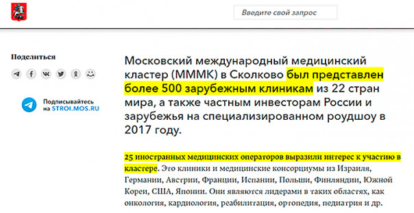 Поэтому нет ничего удивительного в том, что сайт филиала израильской клиники "Хадасса" в Сколково активно рекламирует любые мероприятия, связанные с ГК "Медскан" – своей компанией-владельцем.