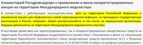 Если отвлечься от сухого законотворческого языка, то речь идёт о том, что МММК в Сколково должен получить право ввозить на территорию России и применять незарегистрированные и не одобренные в России препараты. Любые. Вообще. Отметим один из наиболее важных моментов: проект не предусматривает применение послаблений исключительно к каким-либо вакцинам. Тогда бы в документе так и было сказано. Но речь идёт вообще обо всех незарегистрированных препаратах, которые смогут ввозиться в Россию и применяться в Сколково. И это уже очень серьёзно.