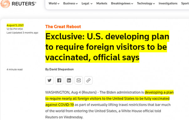 5 августа 2021 года информационное агентство Reuters поделилось эксклюзивом о том, что администрация президента США Джо Байдена рассматривает запрет на въезд в страну для всех иностранцев, не прошедших полный курс вакцинации от COVID-19. Разумеется, не "Спутником", а признанным в США препаратом. Например, Pfizer, Moderna или AstraZeneca.