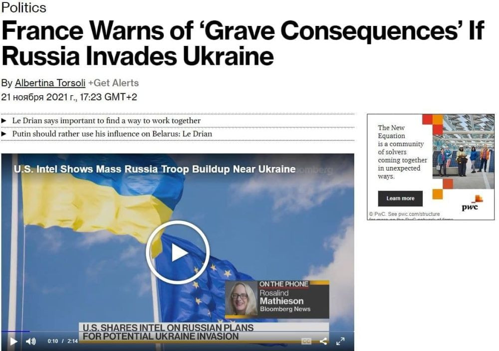 При этом агентство ссылается на заявление министра иностранных дел Франции Жана-Ива ле Дриана, который предупредил, что у подобного сценария развития событий будут весьма серьёзные последствия, а сам он обеспокоен данными «американской разведки». Глава МИД Франции уверен, что необходимо срочно найти способ уладить конфликт на Донбассе дипломатическим путём, чтобы не допустить войну в центре Европы.