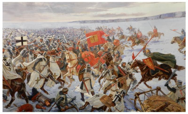 Александр Ярославович с дружинами северо-востока Руси и новгородцами освобождает Псков от немецкого гарнизона, выгоняет немцев из Ижорской земли, и даёт битву 4 апреля 1242 г. на берегу Чудского озера.
