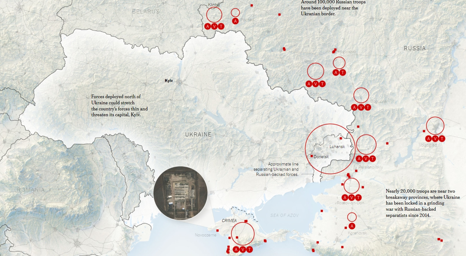 Выше, вы можете увидеть разработанную и опубликованную карту «окружения» российскими войсками Украины от The New York Times. Ниже заголовок под которым была она опубликована.