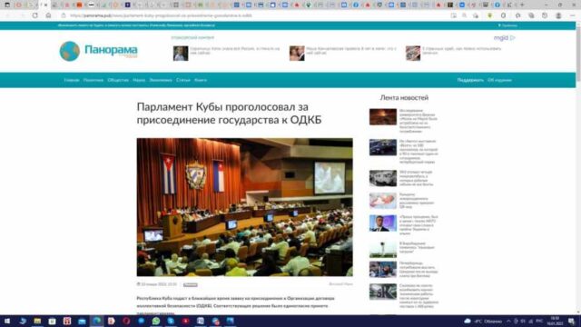 Тем временем, у нас уже докатились до того, что в качестве серьезной новости по социальным сетям и даже по отдельным интернет-СМИ разгоняют произведение пародийно-смехаческого сайта «Панорама» под заголовком: «Парламент Кубы проголосовал за присоединение государства к ОДКБ».
