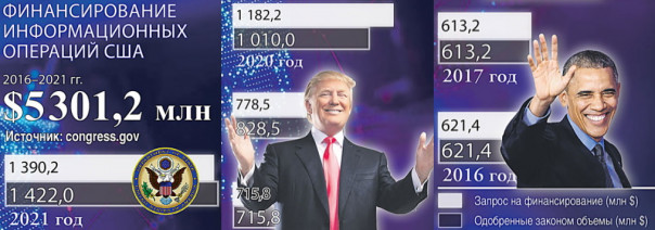 Для полноты понимания задействованных в информационной войне ресурсов целесообразно обратить внимание на результаты проведенного анализа динамики объемов финансирования развития отдельных направлений ИКТ, разведывательных информационных технологий, НИР и информационных операций, предусмотренные законами о национальной обороне США, с 2016 по 2021 год, которые выросли до 1 миллиарда 390 миллионов долларов.