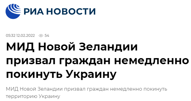 "В связи с повышением напряженности между Россией и Украиной правительство Новой Зеландии рекомендует новозеландцам, находящимся на Украине, немедленно покинуть страну, пока имеются коммерческие рейсы, которые могут доставить их домой", — заявила глава МИД Новой Зеландии Наная Махута в коммюнике.
