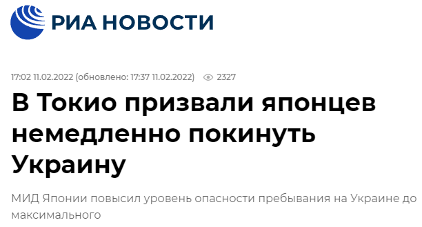 "Те, кто в настоящее время находятся на Украине, пожалуйста, немедленно покиньте её территорию, используя все безопасные средства, в том числе коммерческие рейсы. Воздержитесь от поездок на Украину в каких бы то ни было целях", - подчеркивается в сообщении МИД Японии.