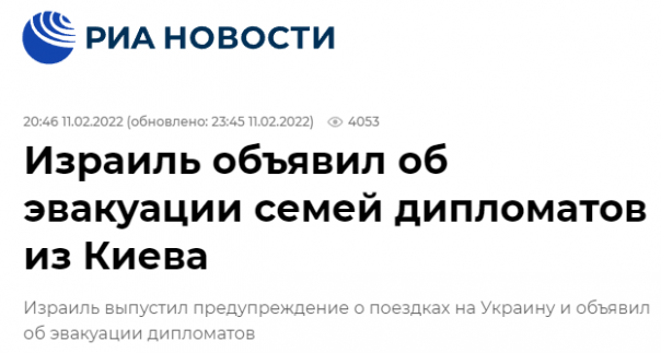 "Министерство иностранных дел приняло решение об эвакуации из Украины членов семей дипломатов и израильских сотрудников посольства", - говорится в заявлении МИД страны.