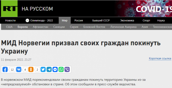 «МИД не рекомендует любые поездки на Украину и призывает норвежских граждан покинуть эту страну», — сообщается на сайте министерства.