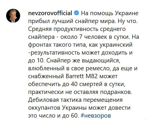 При этом пользователи припомнили, что ещё совсем недавно либеральный российский журналист Александр Невзоров радовался вестям, что «Вали» прибывает на Украину, гарантированно убивать 60 русских в сутки.