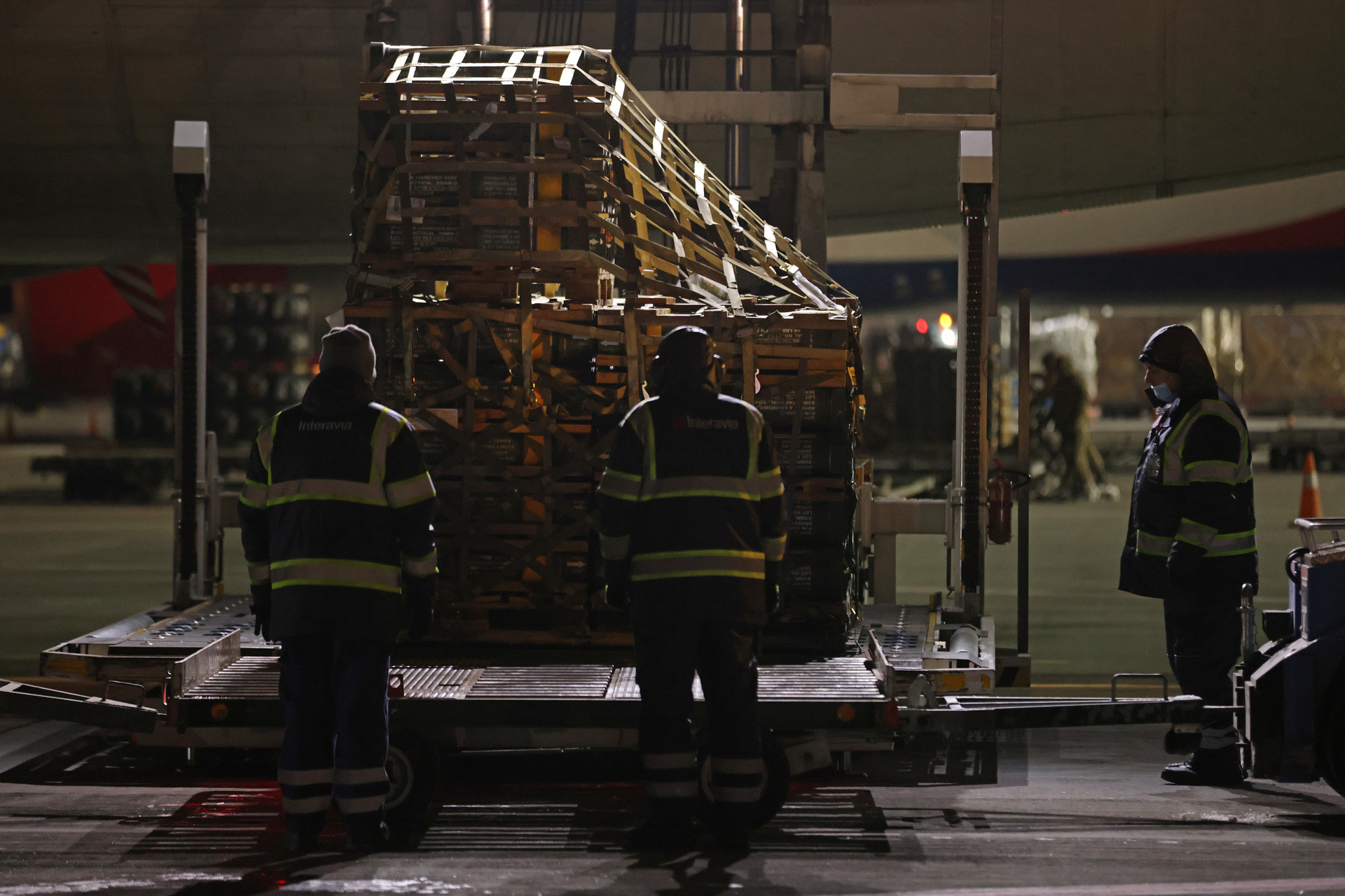 Разгрузка поставленного из США вооружения в киевском аэропорту Борисполь, конец января 2022 года