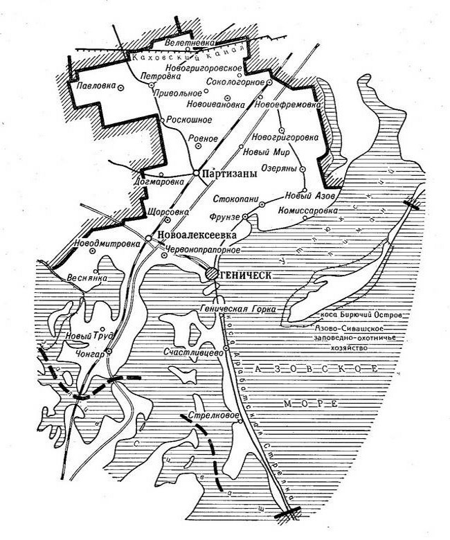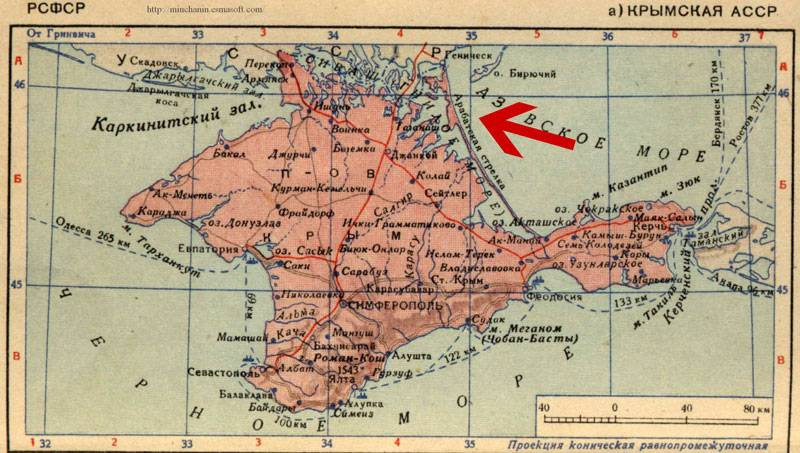 Дело в том, что в марте 1955 года, через год после передачи Крыма в состав Украинской ССР его северо-восточная граница была изменена в пользу Херсонской области Украины. Согласно указу Президиума Верховного совета УССР от 3 марта 1955 г., из Джанкойского района Крымской области в состав Генического района Херсонской области передавались Стрелковский и Счастливцевский сельские Советы. Эти районы составляют более половины протяженности Арабатского полуострова-«стрелки» – песчаной косы, отделяющей залив Сиваш («Гнилое море») от Азовского моря.