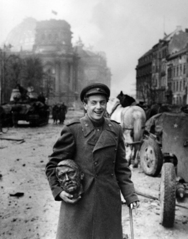 Взгляните на известную фотографию, где Долматовский в Берлине 1945-го стоит со скульптурной головой Гитлера в руках.