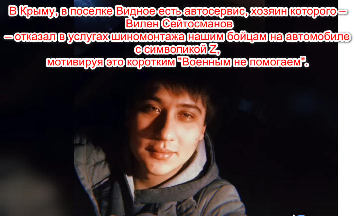 В Крыму, в поселке Видное есть автосервис, хозяин которого – Вилен Сейтосманов – отказал в услугах шиномонтажа нашим бойцам на автомобиле с символикой Z, мотивируя это коротким "Военным не помогаем".