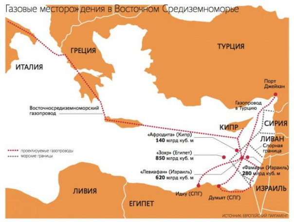 Открытие в Средиземном море Левантийского осадочного бассейна с его колоссальными запасами углеводородов (3−3,5 трлн куб. м газа и 850 млн баррелей нефти) может существенно видоизменить «энергетическую карту» Европы. Открытие в Израиле газового месторождения «Тамар» в 2009 г. с запасами газа в 223 млрд куб. м стало триггером к мощнейшей конкуренции в Восточном Средиземноморье.