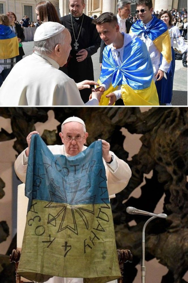 Франциск неоднократно поднимал тему войны на Украине, хотя он сравнил НАТО с собаками, лающими у ворот России, а в интервью LaCiviltà Cattolica высказался о войне так неоднозначно, что возбудил гнев украинства: политолог Небоженко назвал позицию папы хитрой гибридной политикой Ватикана, а журналист Егор Чечеринда обвинил папу в связях с ФСБ (могли б еще и на «Миротворец» занести).