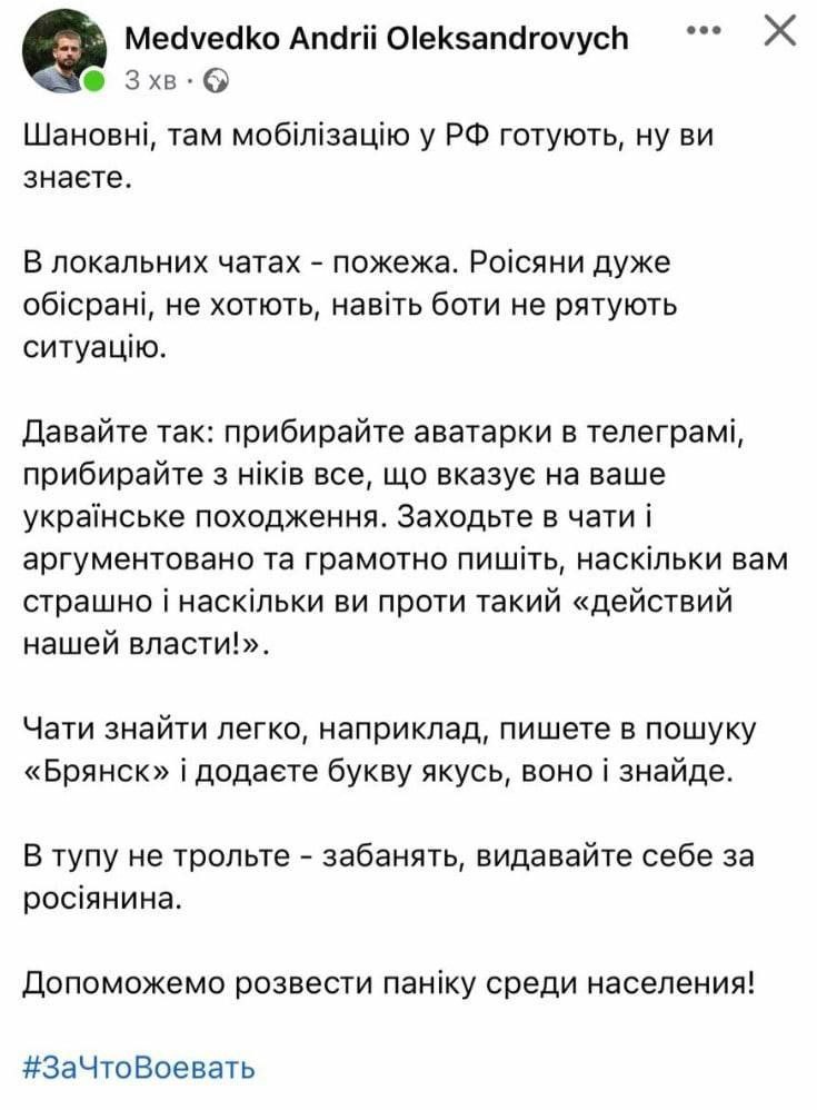 Не успело прозвучать заявление президента России Владимира Путина о частичной мобилизации, как украинские подразделения информационно-психологических операций (ИПсО) через подконтрольные ресурсы и аккаунты в сети начали сеять панику в российском сегменте глобальной сети интернет (см. скрины ниже).
