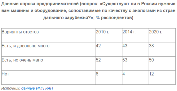 Как видим, за период 2010-2020 гг. отношение российских предпринимателей к возможности приобретения производственного оборудования желаемого качества на внутреннем рынке стало более скептическим. Можно предположить, что это повлияло на конкретные решения промышленников в пользу закупок импортного оборудования.
