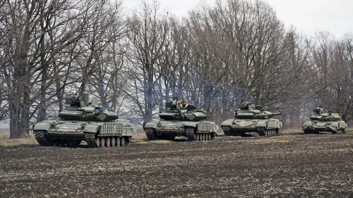 Военные танки на поле двигаются строем