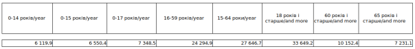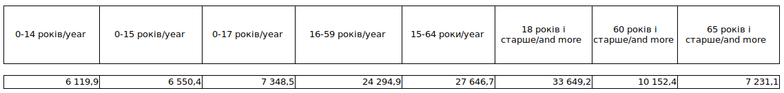 Здесь можно увидеть детей 7348,5 тыс.чел (0-17 лет), активное трудовое население (18-59 лет, вычитаем из категории 18+ категорию 60+) 23496,8 тыс.чел., и население свыше 60 лет (10152,4 тыс.чел.).