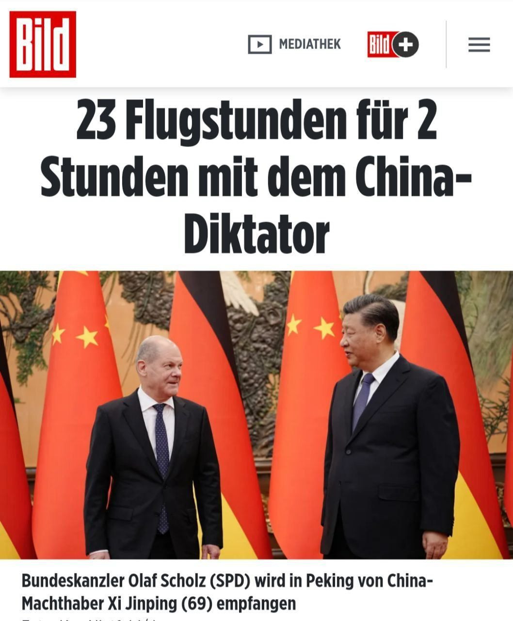 Bild негодует, что канцлер Германии «провел в самолете 23 часа ради 2-х часовой встречи с китайским диктатором Си Цзиньпином»