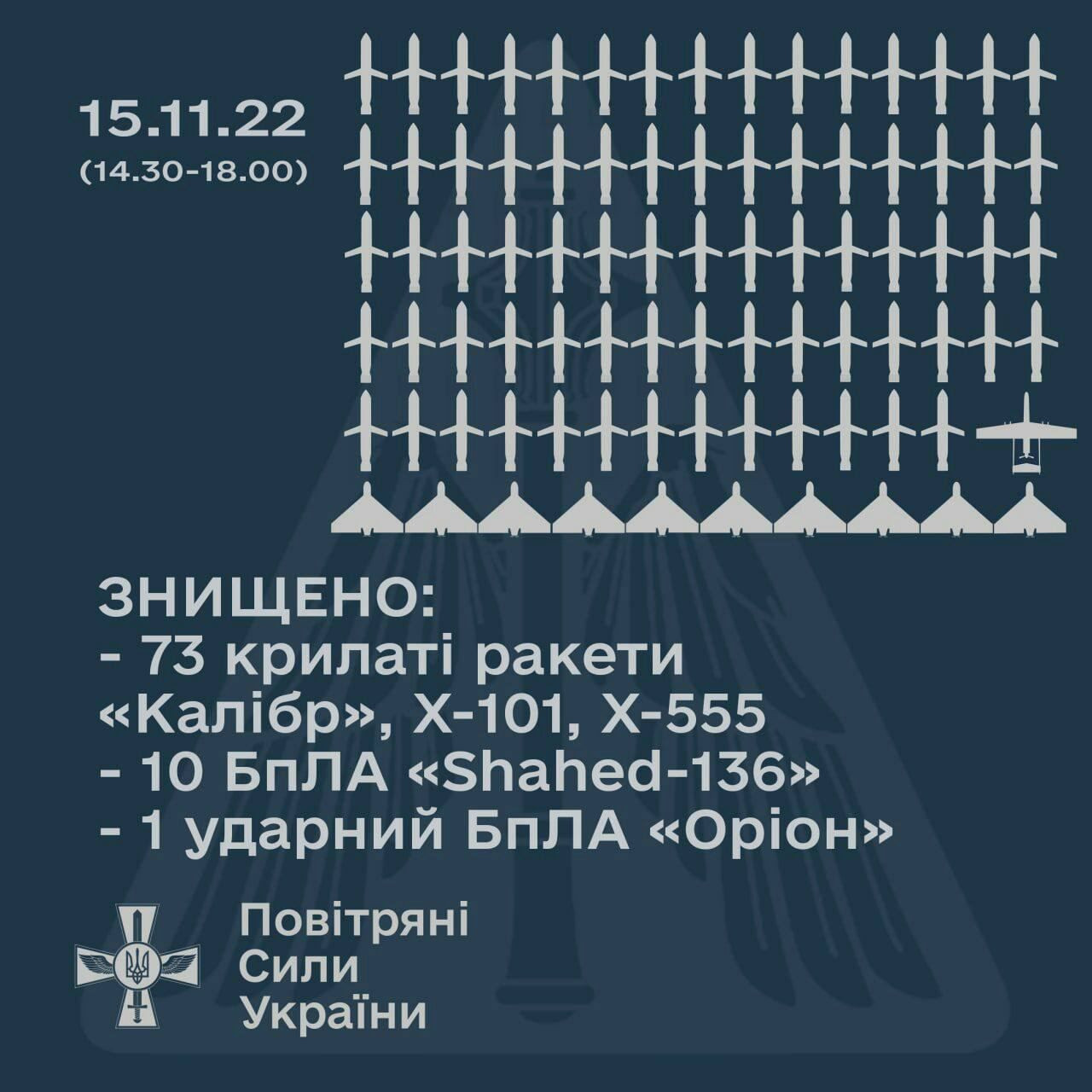 Воздушные силы Украинушки отчитались. Не написали лишь о том, что всё перечисленное уничтожили объекты критической и военной инфраструктуры. Влупили, так сказать, энергетикой и складами вооружения по русским ракетам.