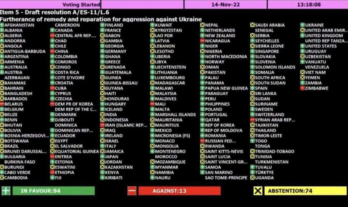 Весьма резонансной стала новость о резолюции ООН, по которой 14 ноября проходило голосование на Генеральной ассамблее этой организации. Речь идет о проекте резолюции по вопросу возмещения ущерба Киеву в результате проведения Российской Федерацией специальной военной операции (СВО). Специальное заседание по данному вопросу было инициировано Канадой, Гватемалой, Нидерландами и Украиной. Согласно проекту документа, ГА ООН «рекомендует создание ее членами, в сотрудничестве с Украиной, международного реестра нанесенного ущерба, который будет служить задокументированным свидетельством заявляемого урона, потерь и ранений, <...> понесенных в результате международно-противоправных действий Российской Федерации на Украине или против нее, а также для продвижения и координации сбора данных».