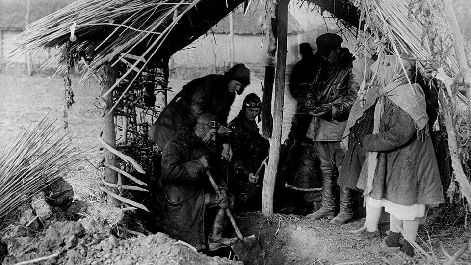 Голод в СССР 1932—1933 гг. Бригада специальной комиссии по хлебозаготовкам откапывает крестьянское зерно, спрятанное в ямах-схронах. 1933 год.