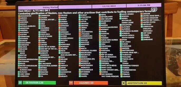 Во-первых, зампостпреда России при ООН Геннадий Кузьмин на заседании Генассамблеи тогда, в декабре 2022-го, сказал: «Итоги голосования в этом году просто шокирующие. Впервые в истории ООН против документа, осуждающего нацизм, а также подтверждающего незыблемость итогов Второй мировой войны проголосовали государства — бывшие члены "Оси". ...Выступившие против резолюции государства, в первую очередь Германия, Япония, Италия, проявили откровенное кощунство в отношении памяти жертв германского нацизма, итальянского фашизма и японского милитаризма. ...Голосуя против, вы думаете, вы тем самым осудили СВО России на Украине? Нет. На самом деле вы показали свою истинную сущность и господствующие воззрения в правящих элитах. Для вас норма — политика пересмотра и отрицания истории, политика терпимости к расистской и ксенофобской риторике, политика высокомерного превосходства».