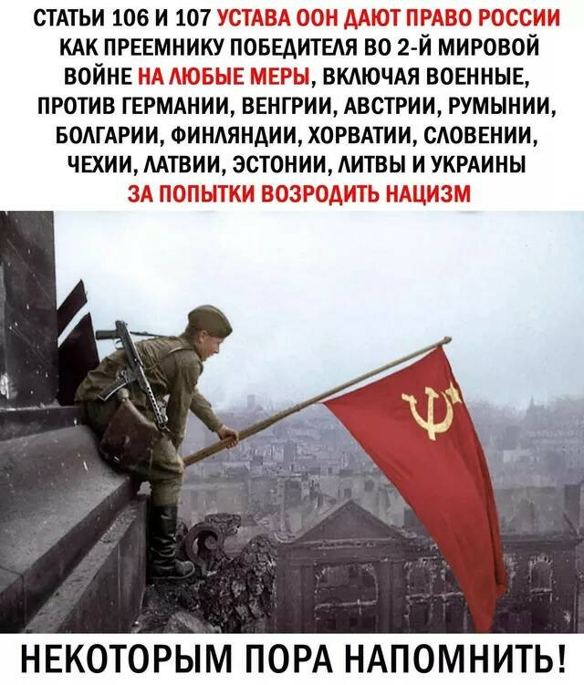 Одни уверены, что статьи 106 и 107 Устава ООН Россию, как правопреемницу СССР — победителя во Второй мировой войне, наделяют правом на все меры, в том числе и военные, против Германии, Венгрии, Австрии, Румынии, Болгарии, Финляндии, Хорватии, Словении, Чехии, Латвии, Эстонии, Литвы и Украины. И именно за попытки возродить нацизм. Или всячески поддержать его возрождение.