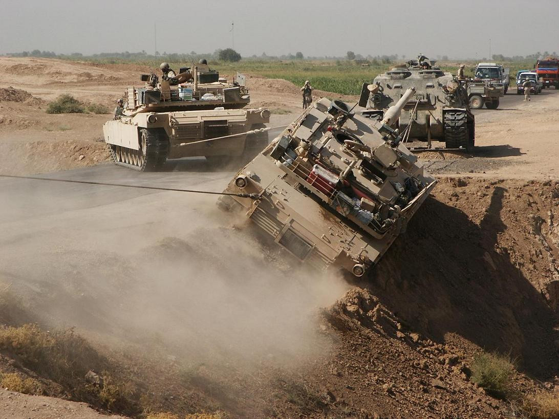 Иракский тягач пытается эвакуировать сгоревший «Абрамс». Вскоре и тягач и остатки «Абрамса» будут уничтожены