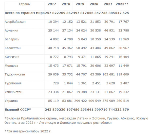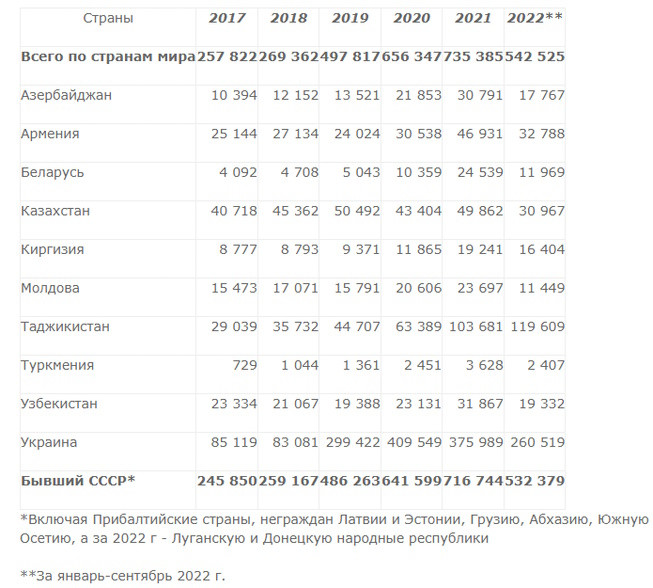 Резкий рост начался с 2019 г., когда было принято решение о предоставлении российского гражданства жителям Донецкой и Луганской народных республик. В 2019 г. число выданных гражданам Украины российских паспортов составило почти 300 тыс., в 2020 г. – 410 тыс., а в 2021 г. – 376 тыс. Но большинство паспортов выдавалось на территории самих народных республик Донбасса и отнюдь не означало физическое перемещение их получателей на территорию России. А в январе-сентябре 2022 г. число выданных гражданам Украины паспортов упало до 260,5 тыс.