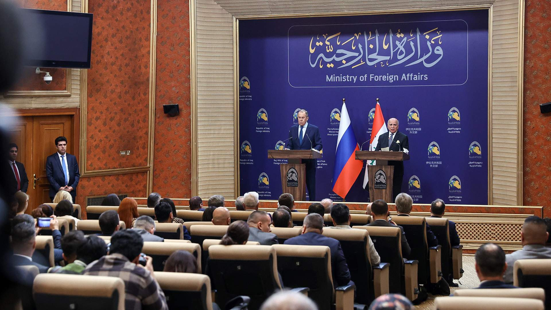 Министр иностранных дел РФ Сергей Лавров и министр иностранных дел Ирака Фуад Хусейн во время российско-иракских переговоров в здании министерства иностранных дел Ирака
