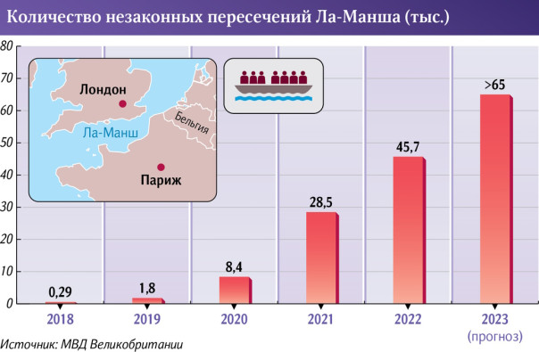 Впрочем, эти усилия оказались бессильны приостановить поток желающих обосноваться в королевстве. За весь прошлый год через Ла-Манш в страну на утлых суденышках и надувным лодках сумело перебраться более 45,7 тыс. человек (для сравнения, в 2021 году таких, по данным британского МВД, было 28,5 тыс.)