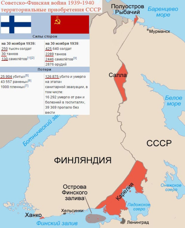 Также к СССР отошел Карельский перешеек площадью около 10.000 кв. км, с населением более 200 тысяч человек и крупными городами Выборгом и Кякисалми (ныне Приозерск) и другими городскими поселениями.