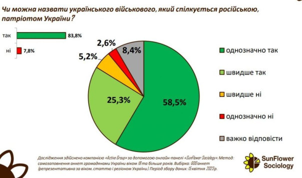 В то же время, когда речь идет о языке и патриотизме в контексте военных, ответы респондентов резко меняются. Украинского военного, который общается на русском языке, патриотом назвали 83,8% опрошенных, лишь 7,8% считает наоборот.