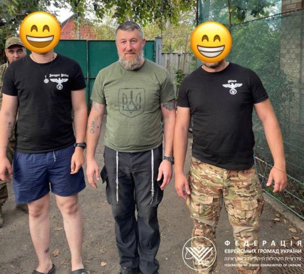 Раввин, представляющий Федерацию еврейских общин Украины, сфотографировался с парочкой украинских нациков в характерных футболках.